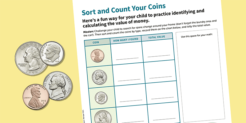 Add up the value of money with spare change around the house and this handy printable. Grades K–5.
